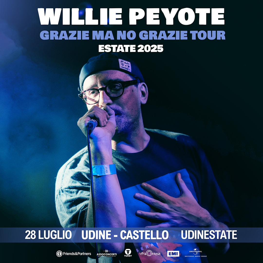 Finalmente arriva l’annuncio che tutti i fan di Willie Peyote stavano aspettando: partirà infatti a giugno il “Grazie ma no grazie tour – Estate 2025”, la serie di date che porterà questa estate il cantautore torinese e la sua band in giro per tutta l’Italia per festeggiare l’uscita del suo ultimo album “Sulla riva del fiume”, che contiene il brano in gara all’ultimo festival di Sanremo “Grazie ma no grazie” che tante soddisfazioni sta regalando a Peyote sia in radio che nelle classifiche. La nuova tournée di quello che negli ultimi anni si è affermato a livello cantautorale come una delle migliori penne della scena italiana, farà tappa anche in Friuli Venezia Giulia per un’unica esclusiva data in programma il prossimo 28 luglio (ore 21.30) al Castello di Udine.